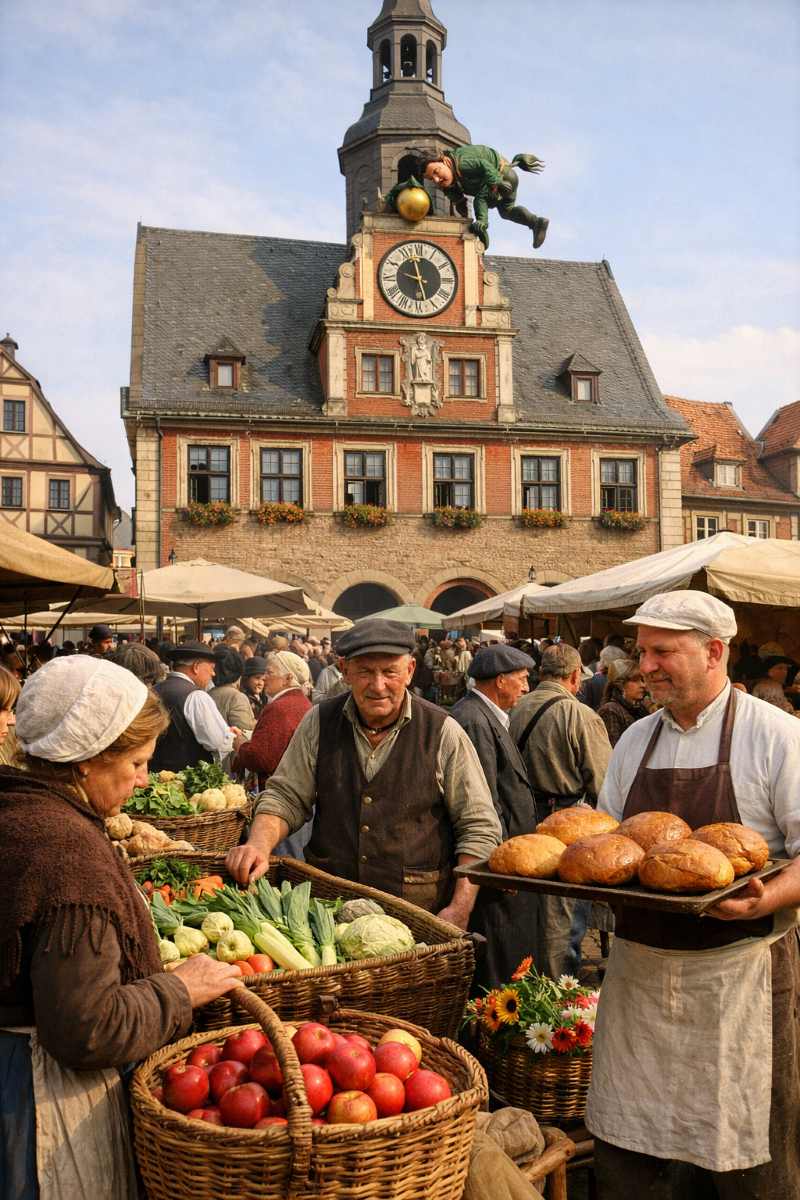 Es ist ein klarer Herbstmorgen in Jena. Über das Kopfsteinpflaster des Marktplatzes rollen schwere Holzkarren, deren Räder im gleichmäßigen Rhythmus knarren. Pferde schnauben vor den Wagen, während Bauern aus den umliegenden Dörfern ihre Körbe und Säcke abladen. In der Luft liegt der Duft von frisch geernteten Äpfeln, Kohlköpfen, Wurzelgemüse und noch warmem Brot. Händler preisen lautstark ihre Waren an, Käufer bleiben stehen, prüfen die Früchte der Ernte und beginnen zu handeln.