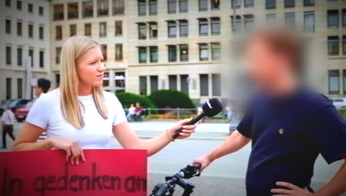 Es ist ein grauer Wintertag in Berlin, das Brandenburger Tor im Hintergrund, als zwei Welten aufeinanderprallen, die sich im digitalen Raum längst blockiert hätten. Auf der einen Seite „Ein Gollan“, konservative YouTuberin und Provokateurin vom Dienst, bewaffnet mit einem Schild: „In Gedenken an die Opfer der Masseneinwanderung“. Auf der anderen Seite ein junger Mann, Fahrrad, wortgewandt, links – und verpixelt.